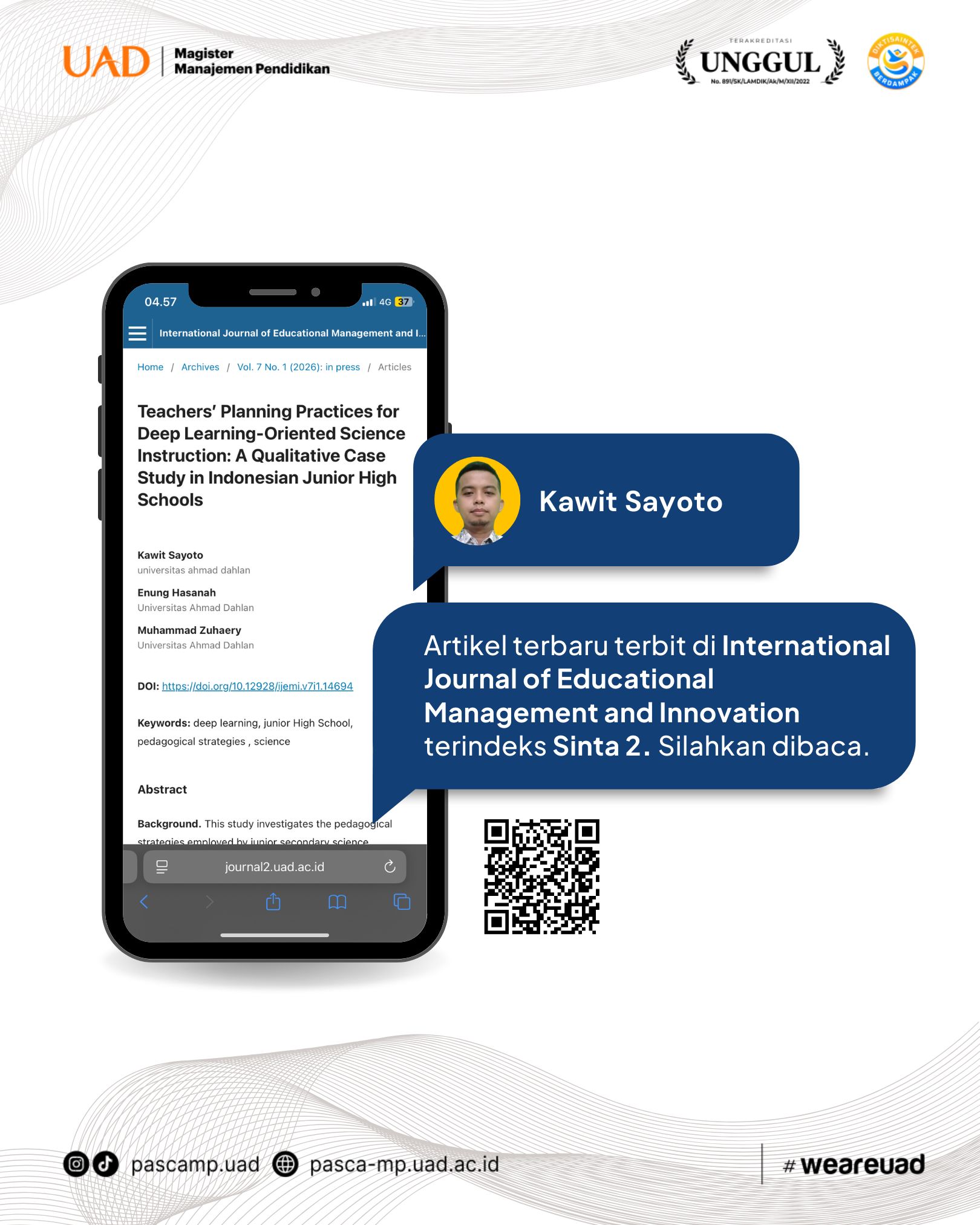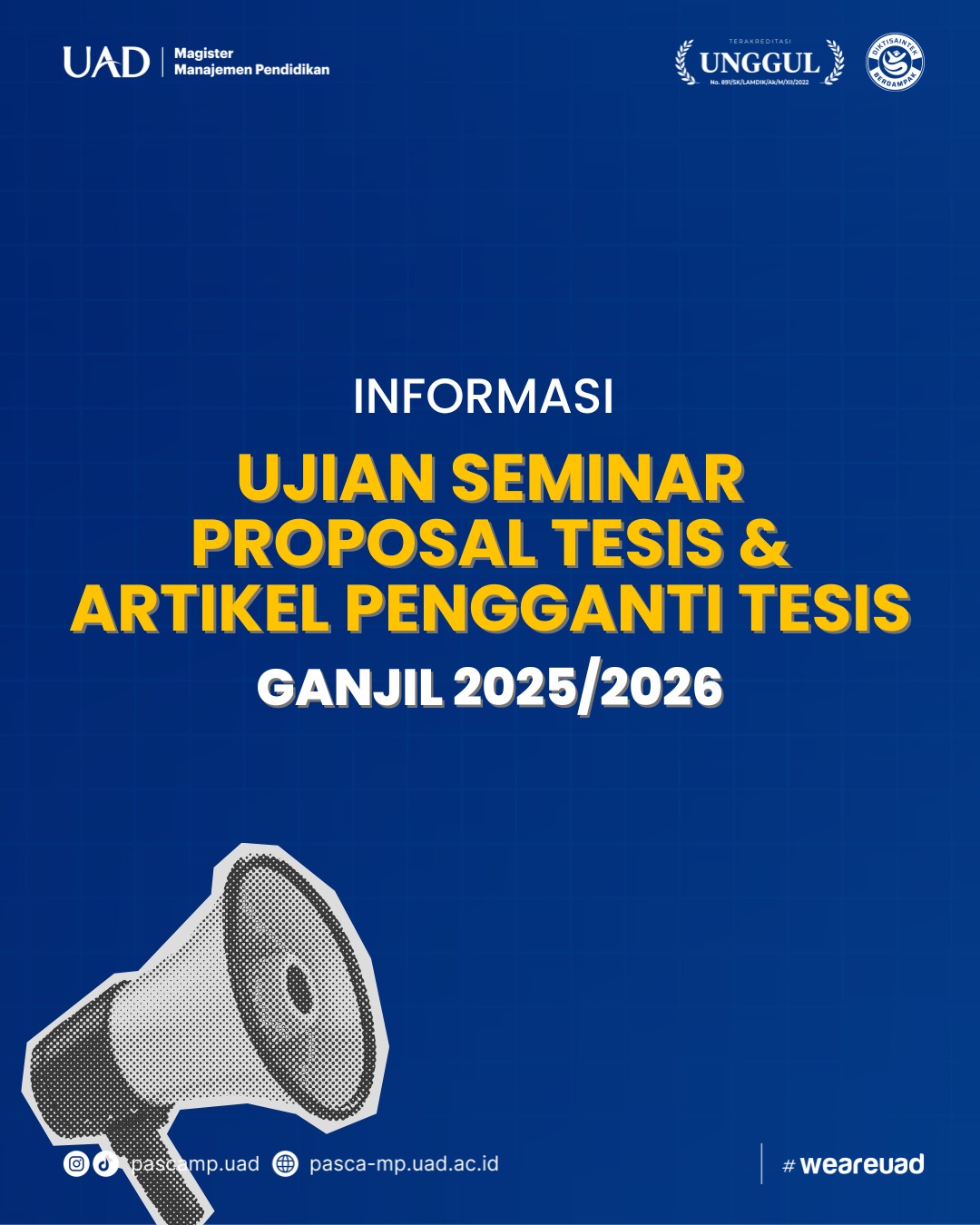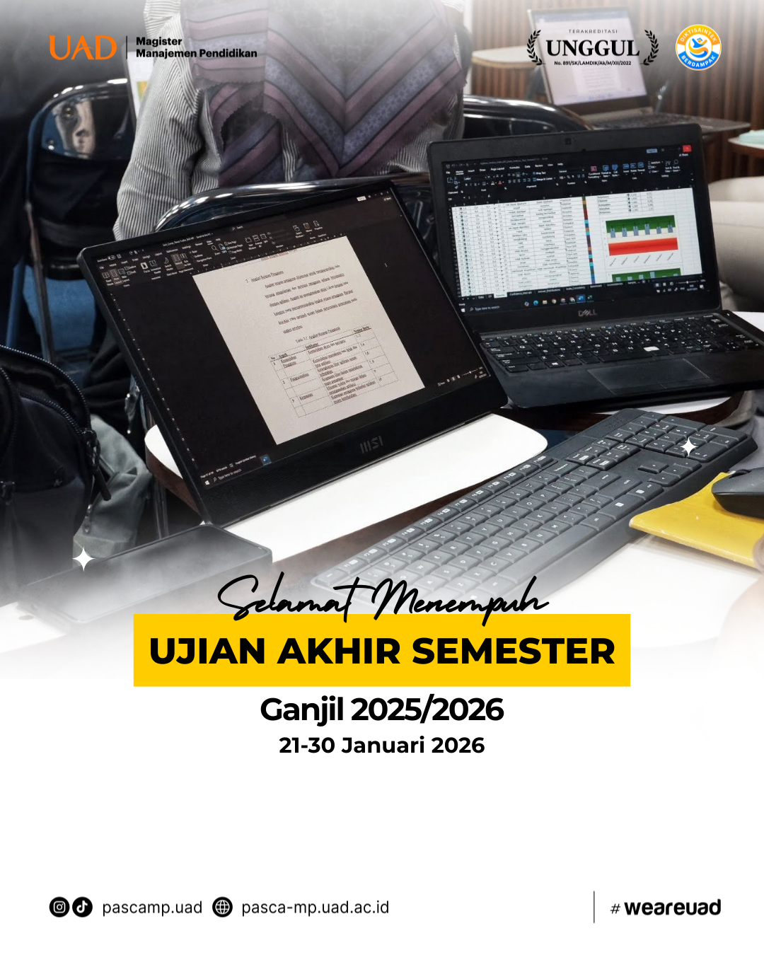 Magister (S2) Manajemen Pendidikan FKIP UAD berdasarkan SK No. 891/SK/LAMDIK/Ak/M/XII/2022 telah terakreditasi UNGGUL dari Lembaga Akreditasi mandiri Pendidikan (Lamdik)