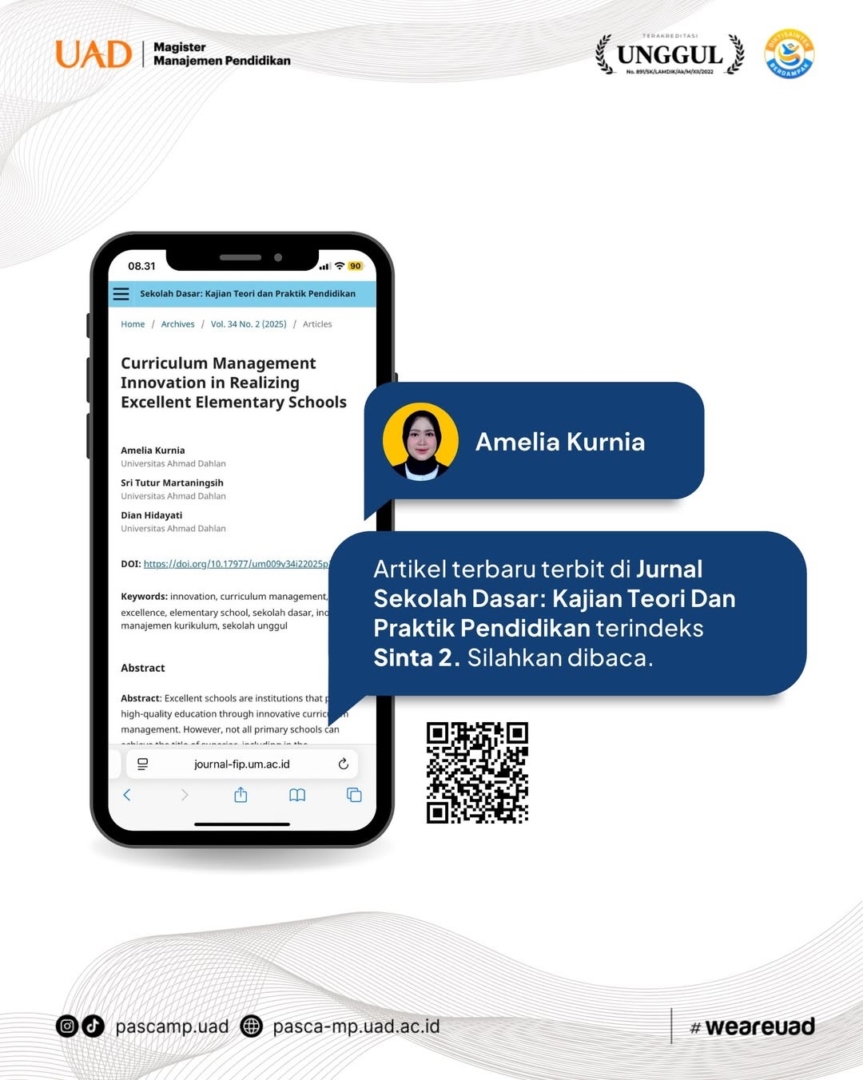 Artikel ditulis oleh Amelia Kurnia bersama Dr. Srti Tutur Martaningsih, M.Pd. dan Dr. Dian Hidayati, MM., terbit di jurnal Sekolah Dasar: Kajian Teori dan Praktik Pendidikan Volume 34 Nomor 2 tahun 2025 terakreditasi Sinta 2.