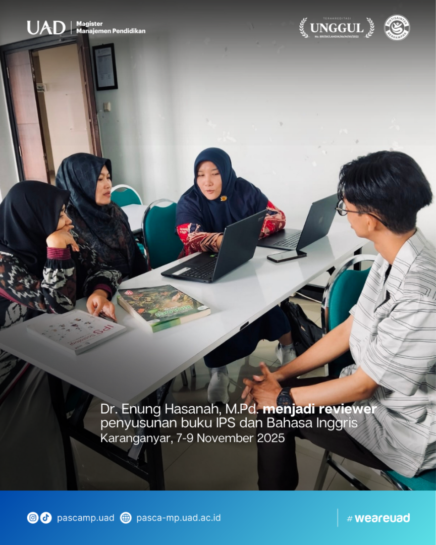 KARANGANYAR – Kaprodi Magister Manajemen Pendidikan (S2 MP) Fakultas Keguruan dan Ilmu Pendidikan Universitas Ahmad Dahlan (FKIP UAD), Dr. Enung Hasanah, M.Pd., turut berperan sebagai pendamping penulis buku IPS bilingual dalam kegiatan yang diselenggarakan oleh Majelis PendidikanDasar Menengah dan Pendidikan Nonformal (PNF) Pimpinan Pusat Muhammadiyah. Kegiatan tersebut berlangsung pada 7–9 November 2025 di Karanganyar, Jawa Tengah.