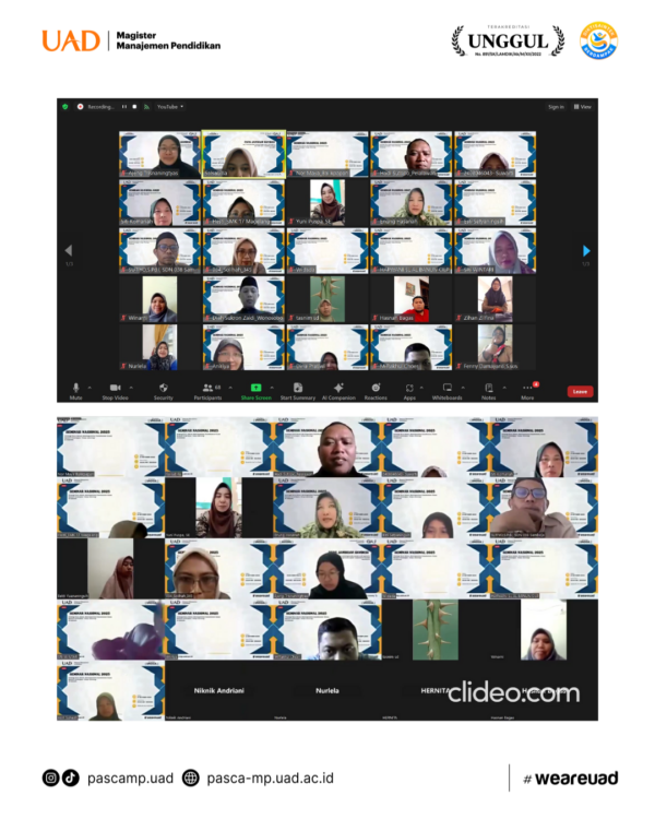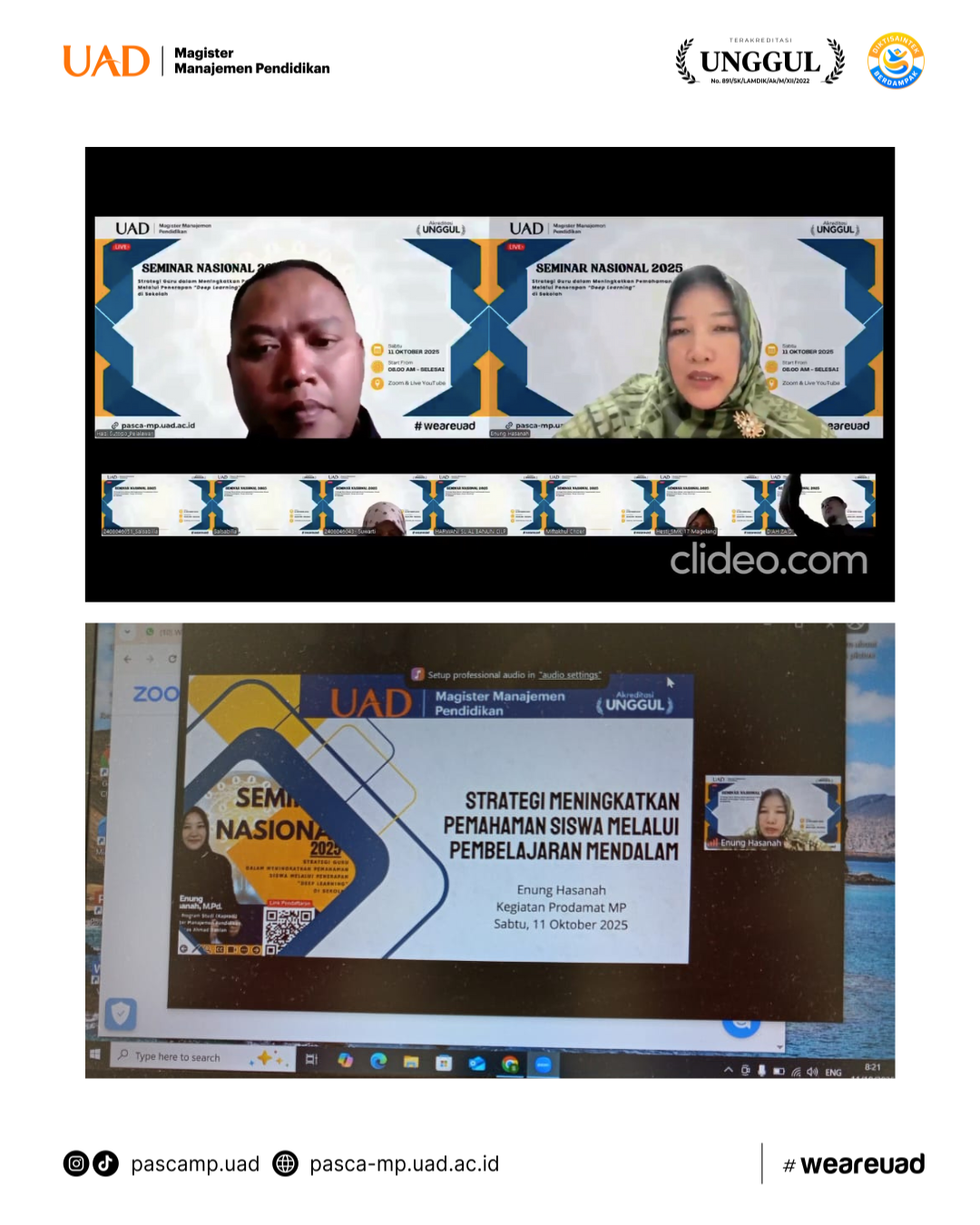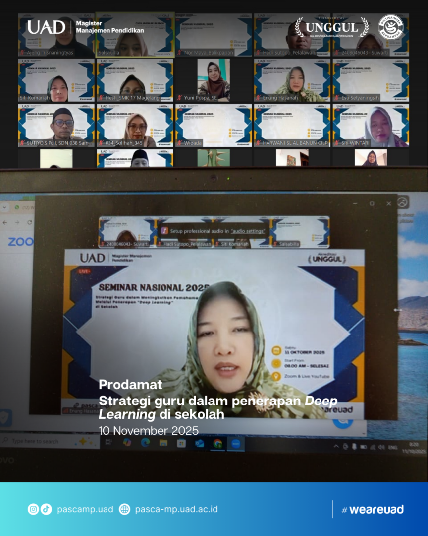 Kelompok Mahasiswa Magister Manajemen Pendidikan FKIP Universitas Ahmad Dahlan (S2 MP UAD) kembali menunjukkan komitmennya dalam pemberdayaan pendidikan melalui Program Pemberdayaan Umat (Prodamat). Pada Sabtu, 11 Oktober 2025, sukses diselenggarakan webinar bertajuk “Strategi Guru dalam Meningkatkan Pemahaman Siswa melalui Penerapan Deep Learning di Sekolah” yang dilaksanakan secara daring melalui Zoom Meeting.