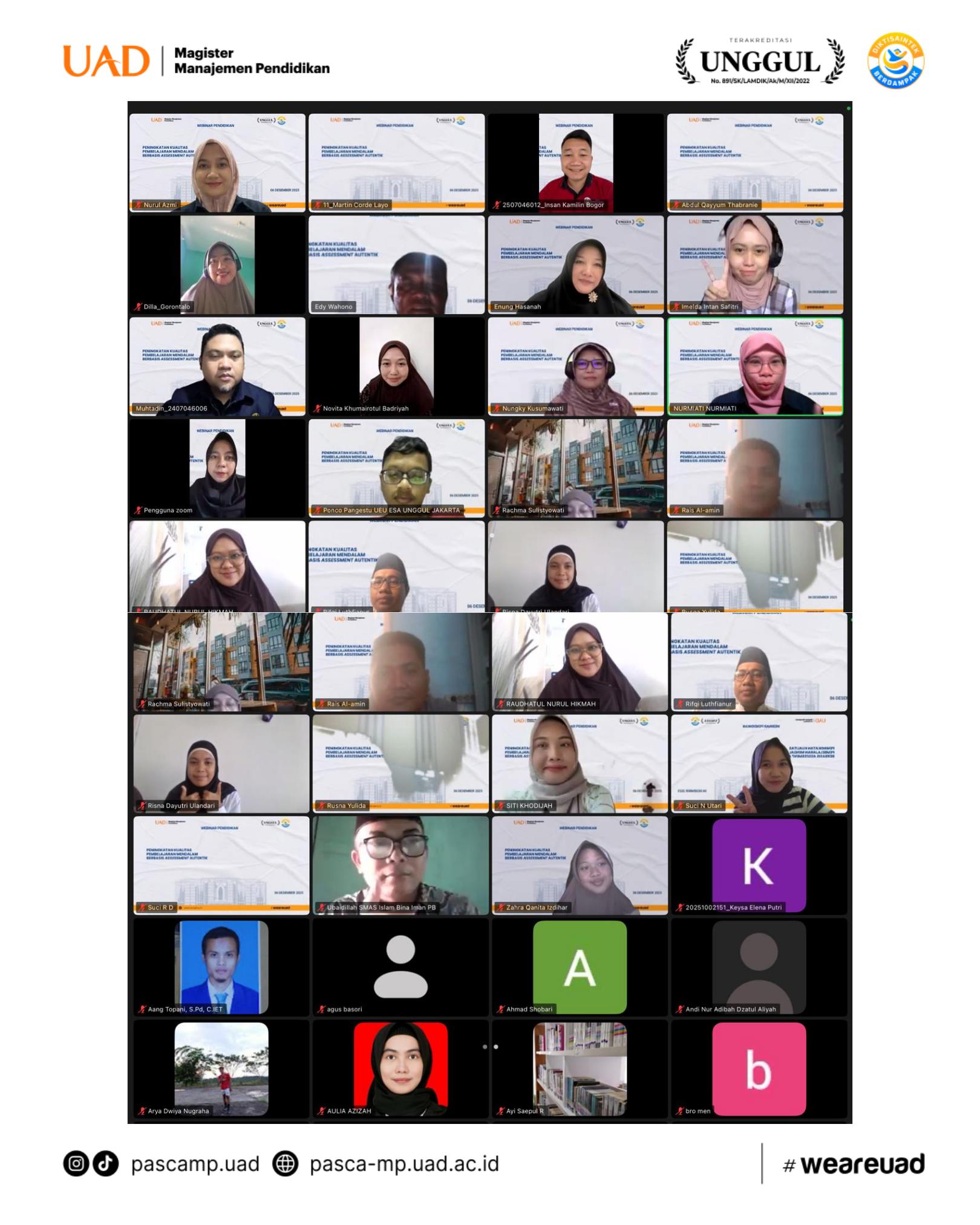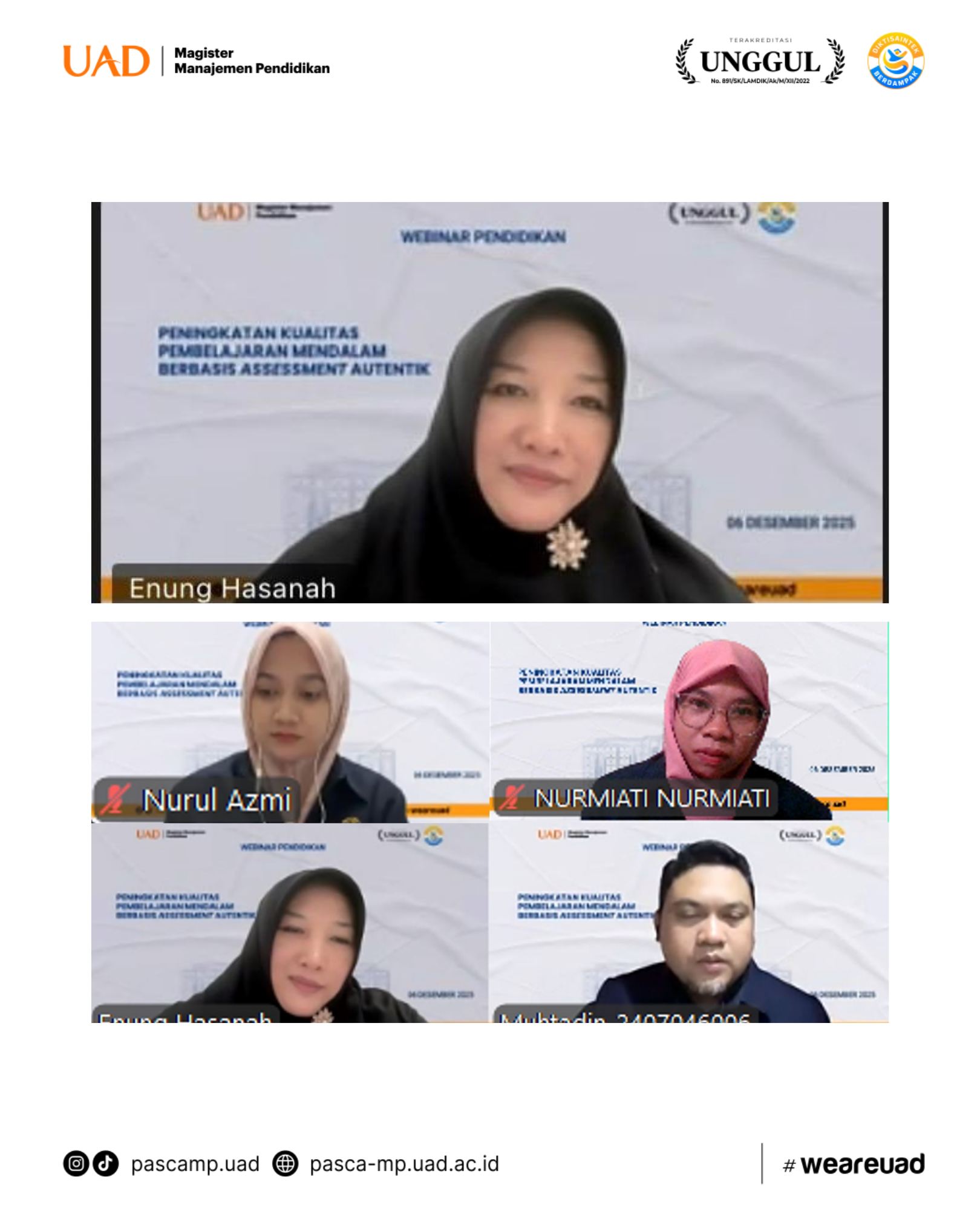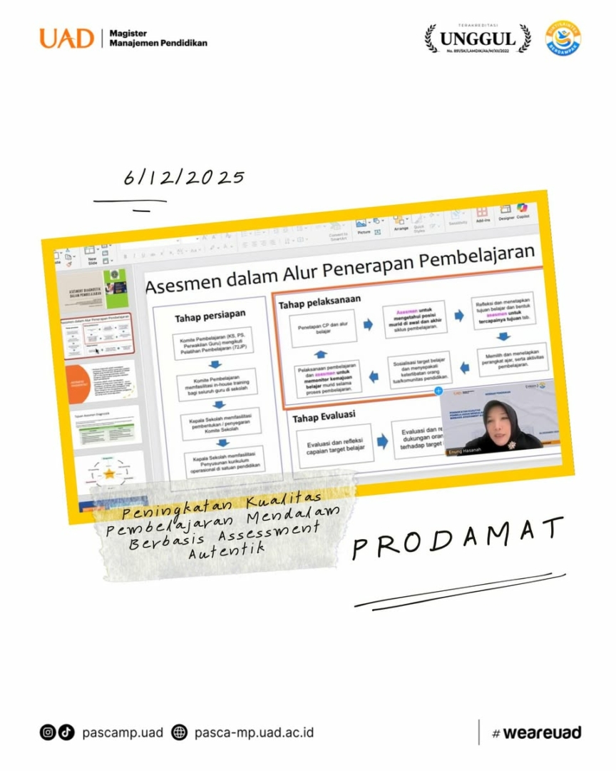 Mahasiswa Program Studi Magister Manajemen Pendidikan (S2 MP) FKIP Universitas Ahmad Dahlan melaksanakan Program Pemberdayaan Umat (Prodamat) melalui kegiatan bertajuk “Webinar Pendidikan: Peningkatan Kualitas Pembelajaran Mendalam Berbasis Asesmen Autentik”. Kegiatan ini tidak hanya menghadirkan forum ilmiah dalam bentuk webinar, tetapi juga menjadi sarana sosialisasi program studi serta visi keilmuan S2 MP UAD kepada para pendidik di seluruh Indonesia.
