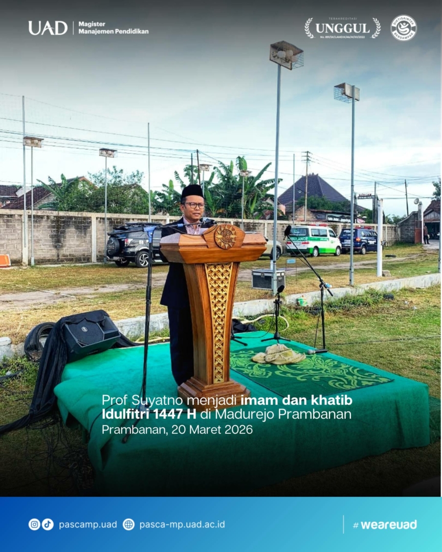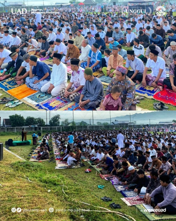Ribuan jamaah memadati Lapangan Madurejo, Prambanan, Sleman, pada Jumat, 20 Maret 2026, dalam pelaksanaan Shalat Idul Fitri 1447 H yang diselenggarakan oleh Pimpinan Ranting Muhammadiyah Madurejo. Dari sudut pandang udara, lautan manusia tampak khusyuk dan tertib, menyatu dalam takbir yang menggema penuh haru. Bertindak sebagai imam sekaligus khatib, Prof. Dr. Suyatno, M.Pd.I., Guru Besar Program Studi Magister Manajemen Pendidikan dan Wakil Dekan FKIP UAD, memimpin jalannya ibadah dengan penuh keteduhan, menghadirkan suasana spiritual yang mendalam bagi seluruh jamaah.