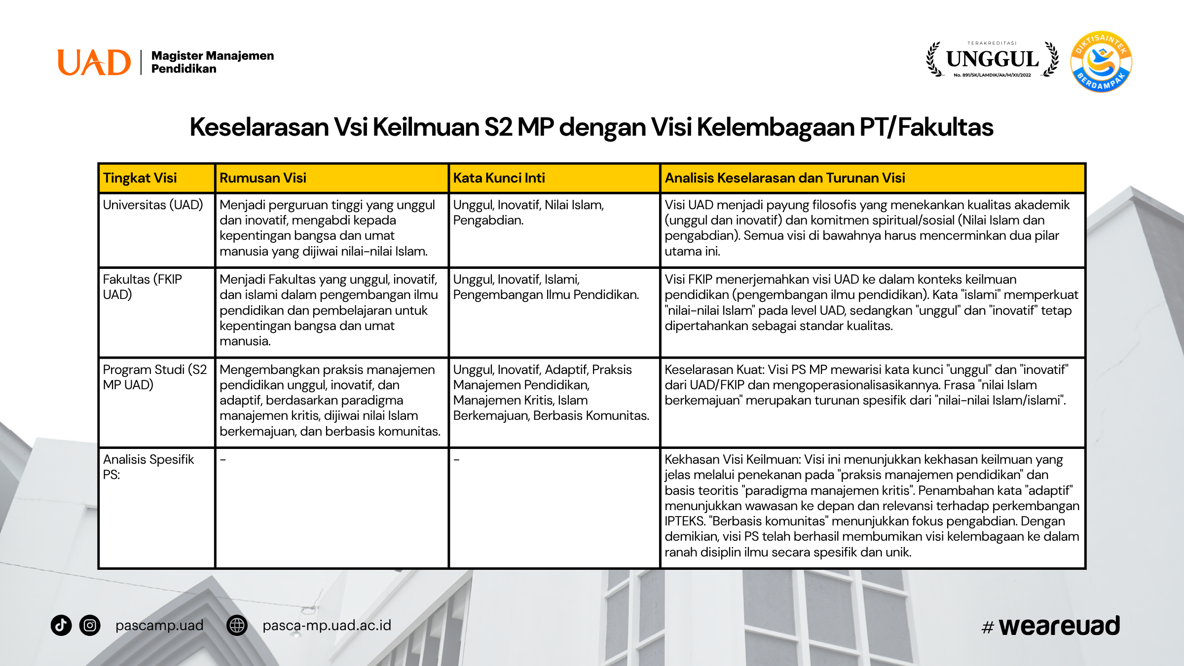 Mengembangkan praksis manajemen pendidikan unggul, inovatif, dan adaptif, berdasarkan paradigma manajemen kritis, dijiwai nilai Islam berkemajuan, dan berbasis komunitas
