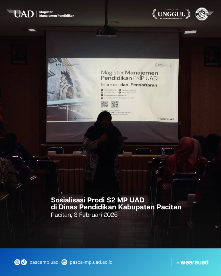 Program Studi Magister Manajemen Pendidikan (S2 MP) FKIP Universitas Ahmad Dahlan melaksanakan sosialisasi kepada para guru dan kepala sekolah se-Kabupaten Pacitan pada 3 Februari 2025, bertempat di Dinas Pendidikan Kabupaten Pacitan. Kegiatan ini menjadi bagian dari upaya memperluas akses informasi studi lanjut bagi para pendidik serta memperkuat jejaring kerja sama dengan pemerintah daerah.