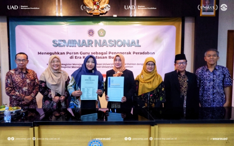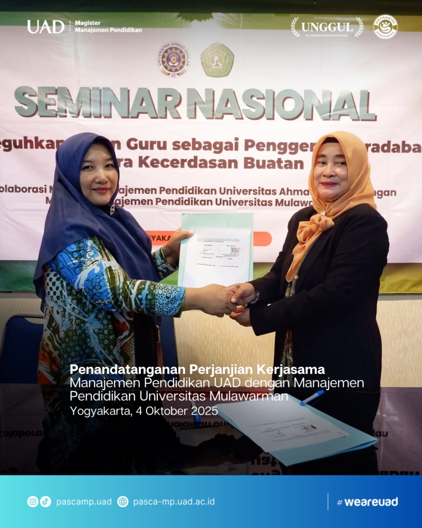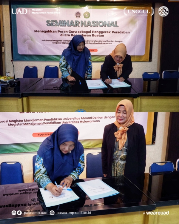Yogyakarta, 4 Oktober 2025 – Magister Manajemen Pendidikan (S2 MP) FKIP Universitas Ahmad Dahlan (UAD) menjalin kerja sama strategis dengan Program Magister Manajemen Pendidikan (S2 MP) FKIP Universitas Mulawarman (Unmul) melalui penandatanganan Perjanjian Kerja Sama (PKS) yang berlangsung di Kampus 2B UAD. PKS ini berfokus pada penyelenggaraan Seminar Nasional 2025 bertema “Meneguhkan Peran Guru sebagai Penggerak Peradaban di Era Kecerdasan Buatan.”