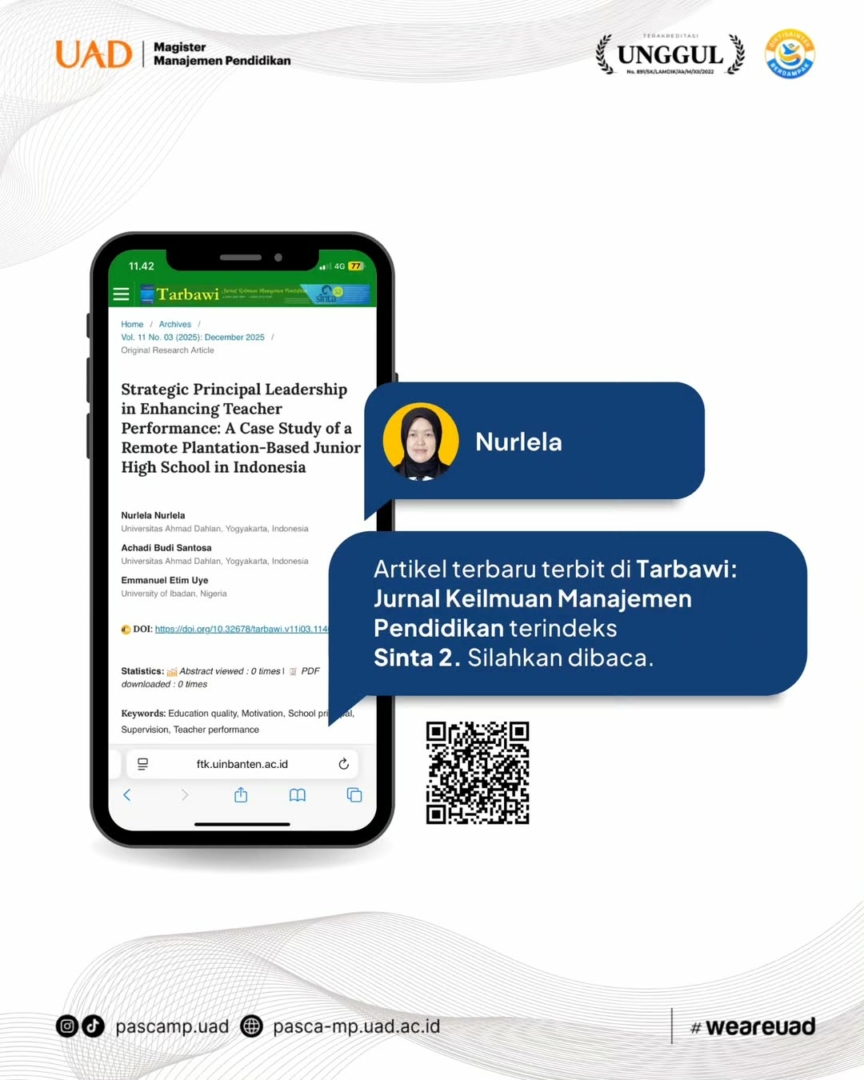 Artikel ditulis oleh Nurlela bersama Dr. Achadi Budi Santosa, M.Pd., yang terbit di Tarbawi: Jurnal Keilmuan Manajemen Pendidikan Volume 11 Nomor 3 tahun 2025 terakreditasi Sinta 2.