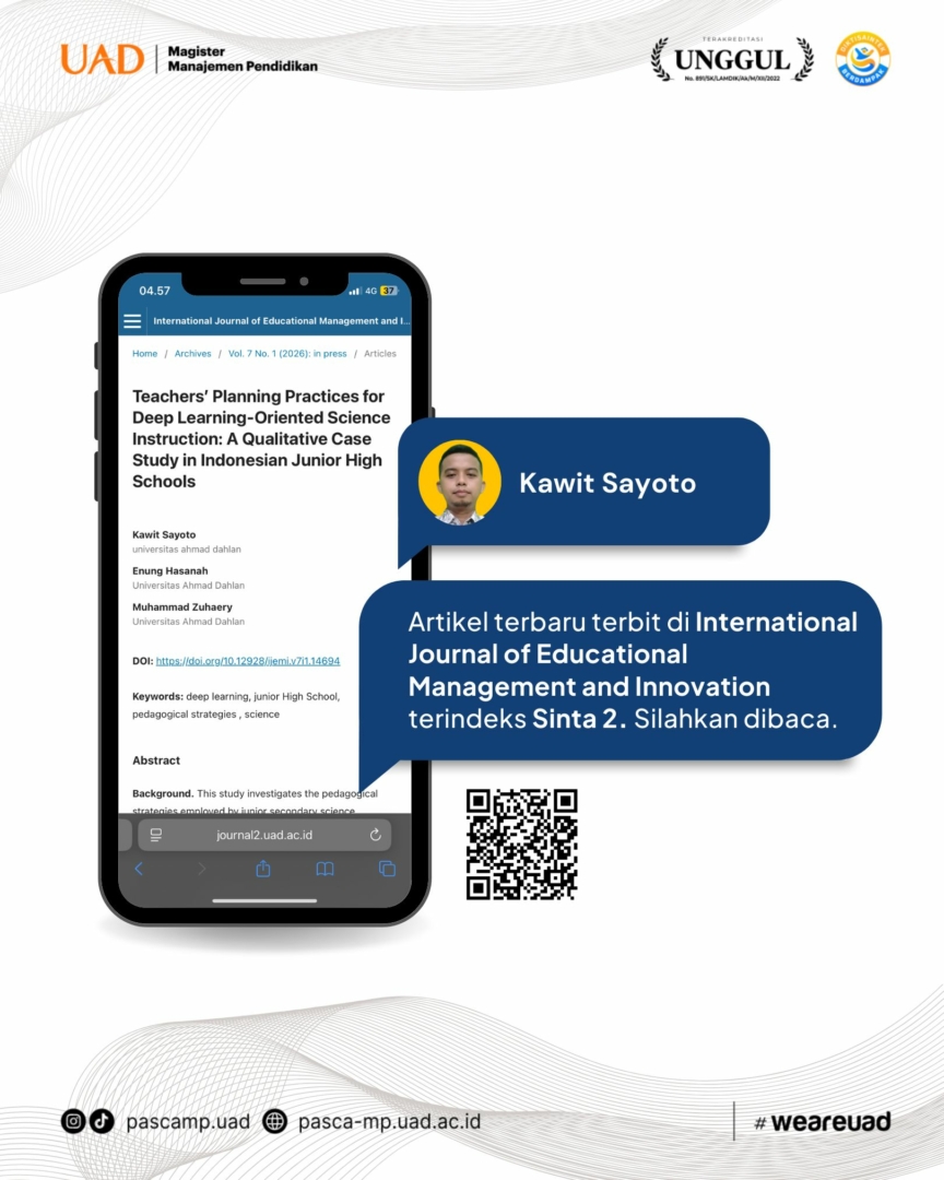 Artikel ditulis oleh Kawit Sayoto bersama dengan Dr. Enug Hasanah, M.Pd., dan Dr. Muhammad Zuhaery, M.A., terbit dalam International Journal of Educational Management and Innovation terakreditasi Sinta 2.