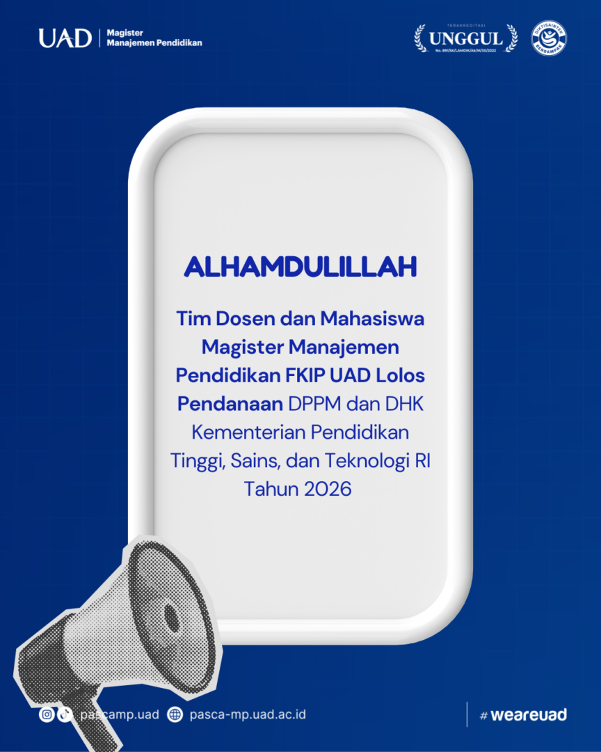 Yogyakarta — Kabar membanggakan datang dari Program Studi Magister Manajemen Pendidikan (S2 MP) FKIP Universitas Ahmad Dahlan (UAD). Tim dosen dan mahasiswa berhasil meraih pendanaan dalam program kompetitif yang diselenggarakan oleh Direktorat Penelitian dan Pengabdian kepada Masyarakat (DPPM) serta Direktorat Hilirisasi dan Kemitraan (DHK) Kementerian Pendidikan Tinggi, Sains, dan Teknologi (Kemdiktisaintek) Republik Indonesia Tahun 2026.